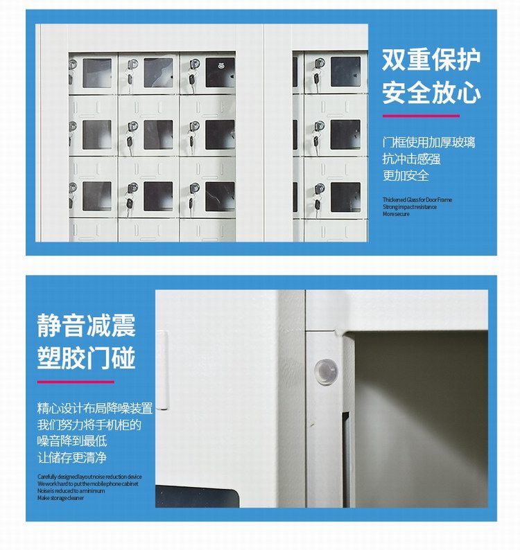 手機保密柜正面為對開金屬邊框玻璃大門,便于觀察柜內(nèi)情況,堅固透亮,美觀大方。